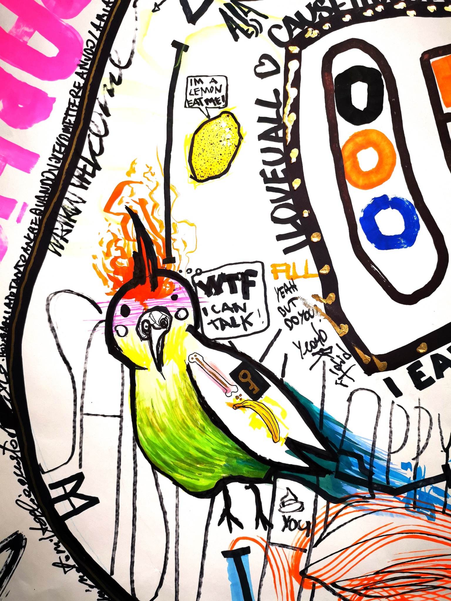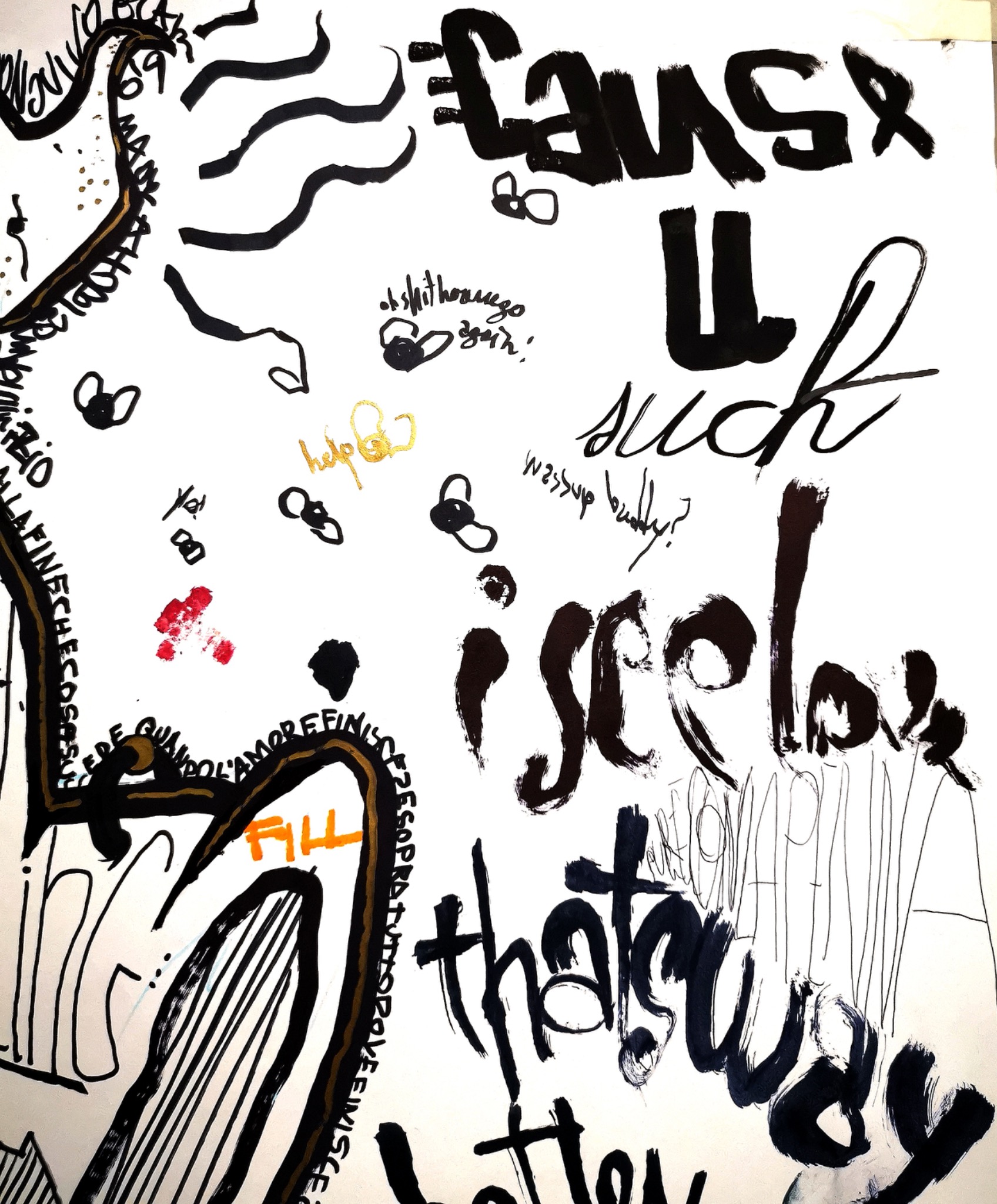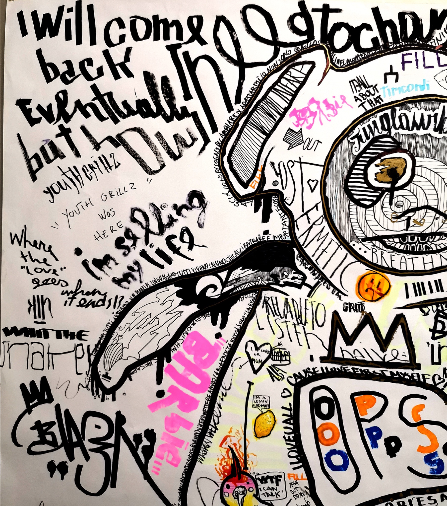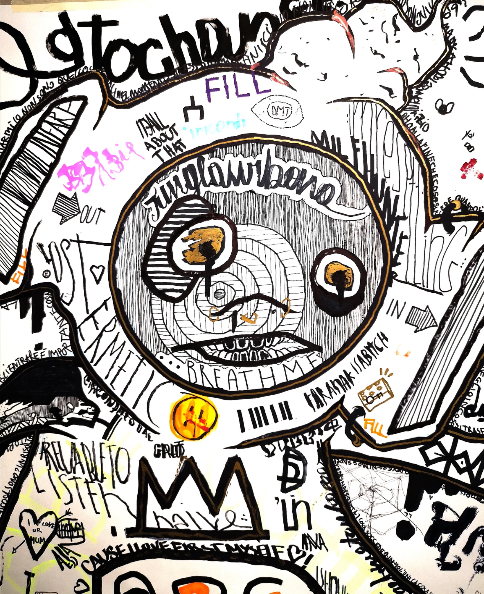 I first drew the outline during one of the events at my ex studio, but the piece did not come all at once. I left it open and kept returning to it over the course of a year, adding something each time life hit me with a new situation, a new intimacy, a new fracture, or a new emotional charge. In that sense, the work became an accumulation of personal moments, layered one over another, almost like a diary in expanded form, but translated into image instead of words.