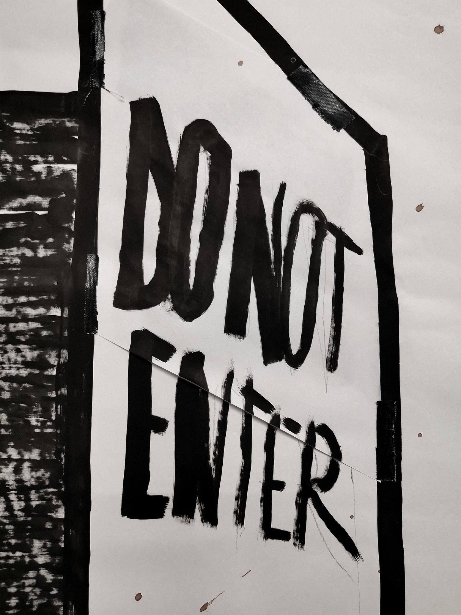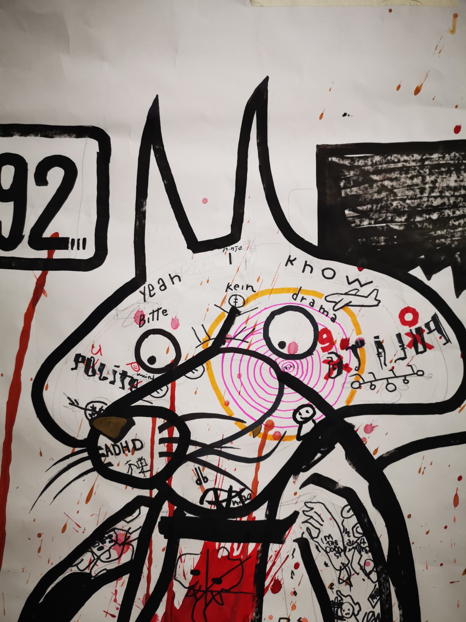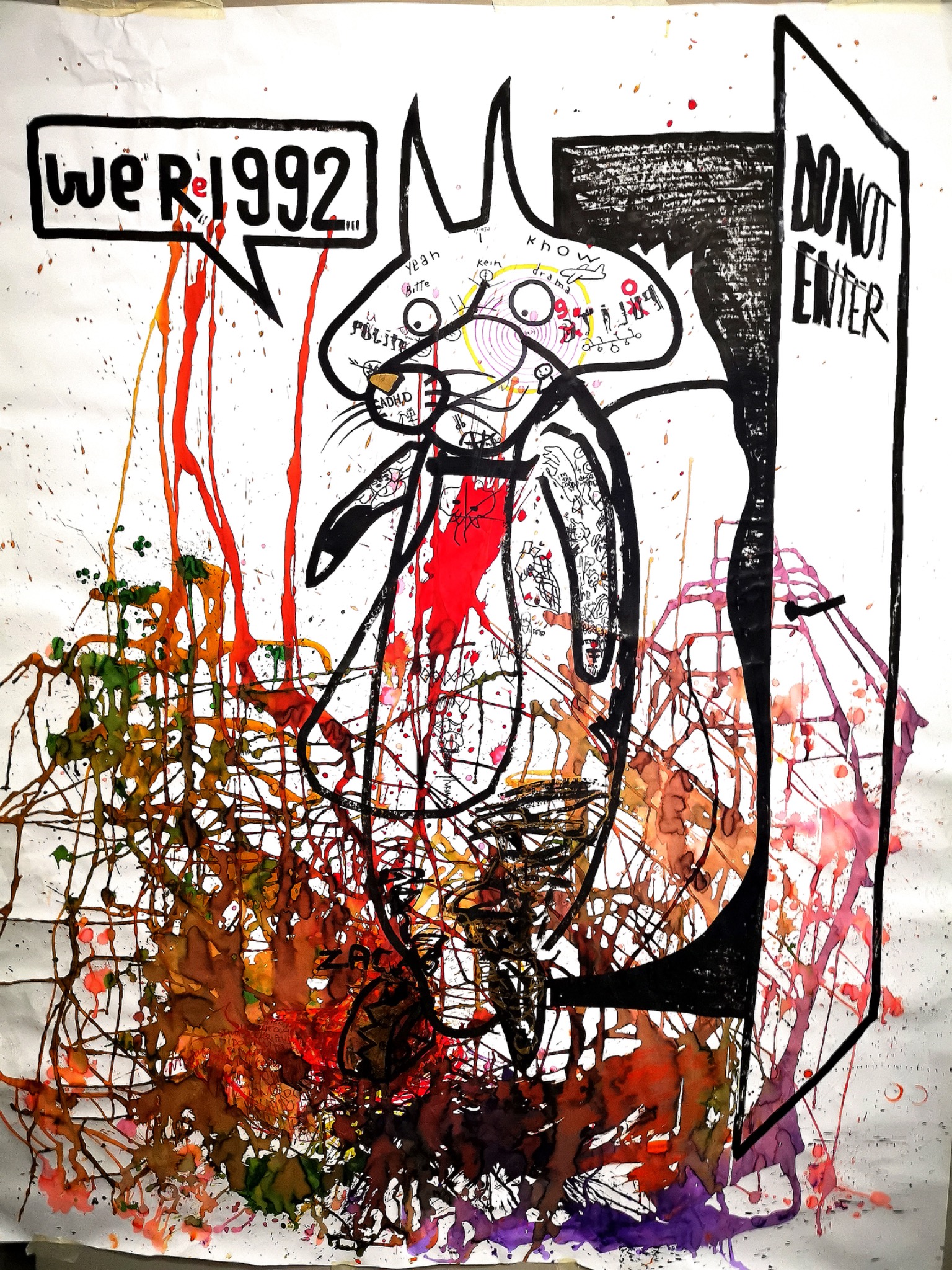 The fox represents what I feel to be my animal spirit, and it is also the only cartoon figure I have tattooed more than once, since I normally create one-time-only tattoos. In this piece, I projected my own identity onto the fox, marking it with my tattoos as a way of turning it into a stand-in for myself. I placed a door marked “not enter” in front of it, along with a bear trap that catches its leg and blocks its movement, transforming the image into a direct metaphor for exclusion, betrayal, and violent interruption. The phrase “We’re 1992” refers to R1992, the name of our project, a title that originally carried the meaning of we are 1992. After that break, that “we” no longer existed.
