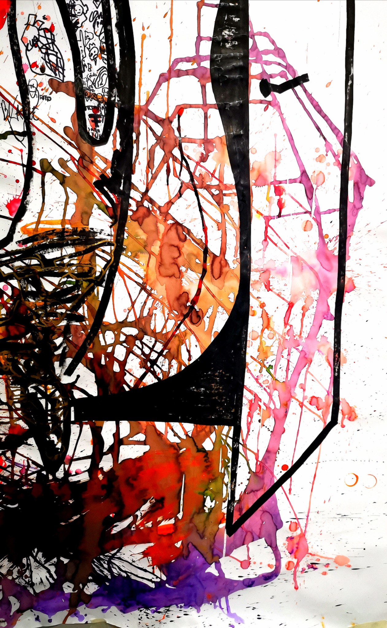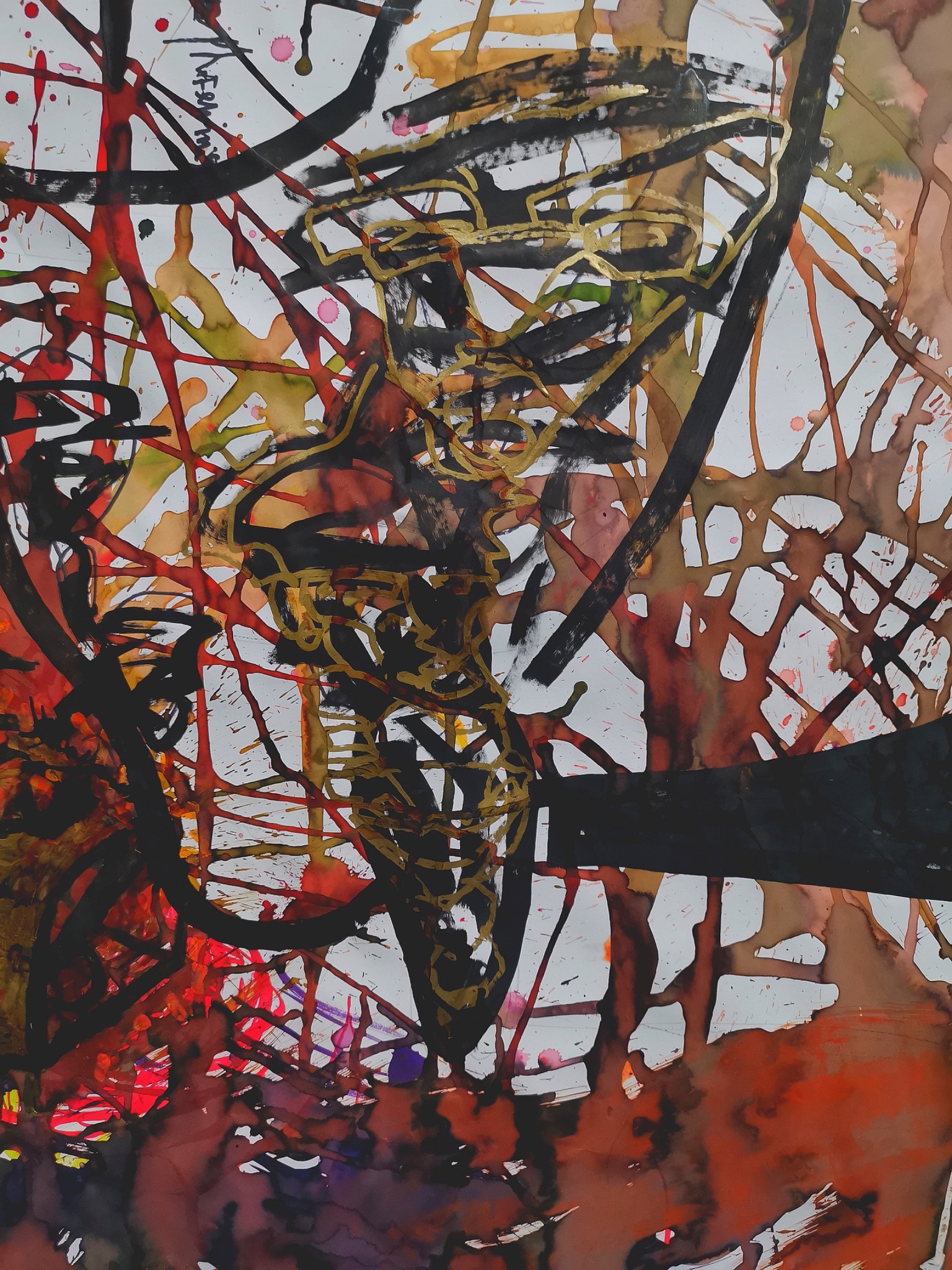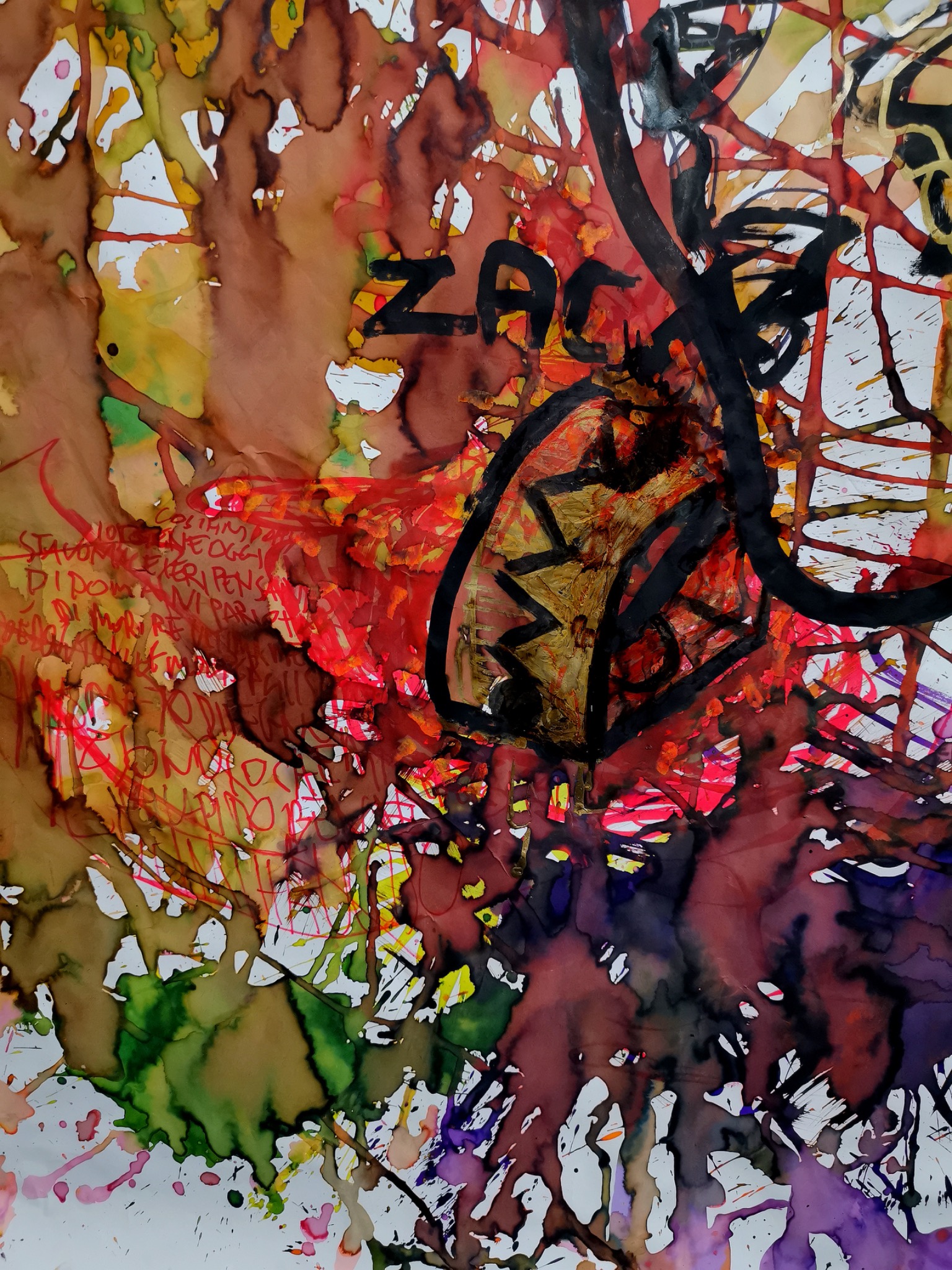 To emphasize the pain of that fracture, I used ecoline to imitate the effect of blood, together with a particular red ink I created from natural pigment and a drop of my own blood. In that sense, the work is not only symbolic, but physically tied to my body and my experience. It became a way to process the trauma, reclaim the narrative, and turn a moment of expulsion into an image of resistance.